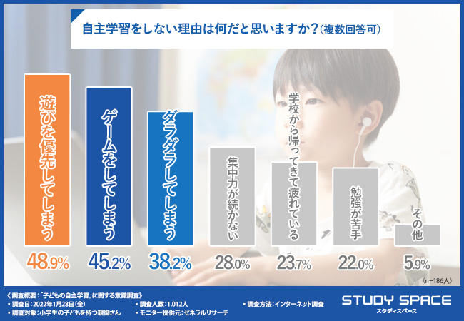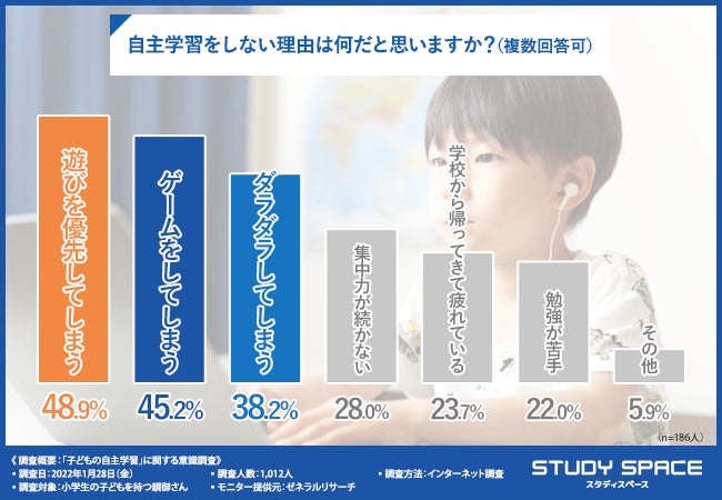 はじめの質問で『いいえ』と回答した方に、「自主学習をしない理由は何だと思いますか?(複数回答可)」と質問したところ、『遊びを優先してしまう(48.9%)』と回答した方が最も多く、次いで『ゲームをしてしまう(45.2%)』『ダラダラしてしまう(38.2%)』と続きました。