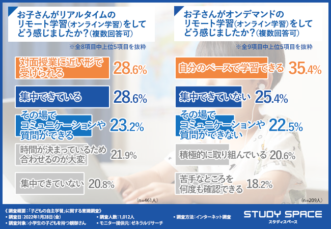 続いて、『経験あり(録画教材のようなオンデマンド型授業)』『どちらもある』と回答した方に、「お子さんがオンデマンドのリモート学習(オンライン学習)をしてどう感じましたか?(複数回答可)」と質問したところ、『自分のペースで学習できる(35.4%)』と回答した方が最も多く、次いで『集中できていない(25.4%)』『その場でコミュニケーションや質問ができない(22.5%)』と続きました。