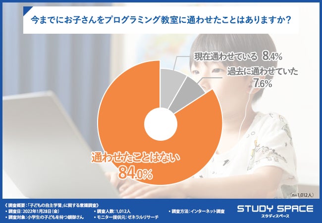 そこで、「今までにお子さんをプログラミング教室に通わせたことはありますか?」と質問したところ、『現在通わせている(8.4%)』『過去に通わせていた(7.6%)』『通わせたことはない(84.0%)』という結果になりました。