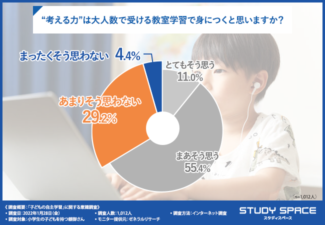 そこで、「“考える力”は大人数で受ける教室学習で身につくと思いますか?」と質問したところ、『とてもそう思う(11.0%)』『まあそう思う(55.4%)』『あまりそう思わない(29.2%)』『まったくそう思わない(4.4%)』という結果になりました。