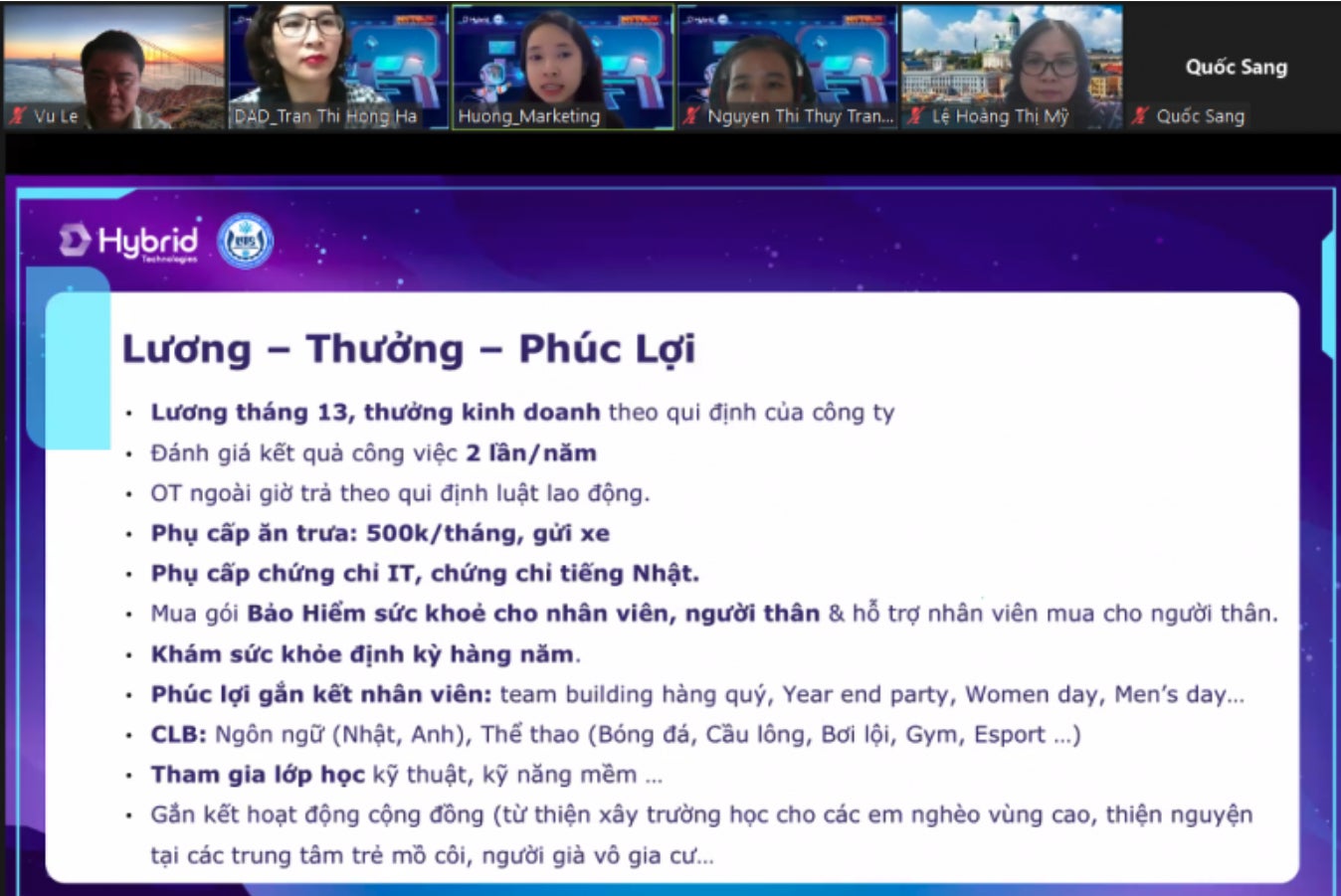 当セミナーには、当社からプロジェクト管理者のトラン・ゴック・ハーさんやその他の経験豊かな開発者も参加し、プログラミングにおける実務的な経験や、人気のあるプログラミング言語の選定、テックリーダーになるための助言と新入生が必要とするスキルなどについて講義を実施しました。さらに、ハイブリッドテクノロジーズ人事担当者からの会社説明も行われ、ハイブリッドテクノロジーズにおける様々なキャリアチャンスについてもご紹介いたしました。セミナーに参加した70人以上の学生たちも積極的にご参加いただき、多くのご質問もいただきました。