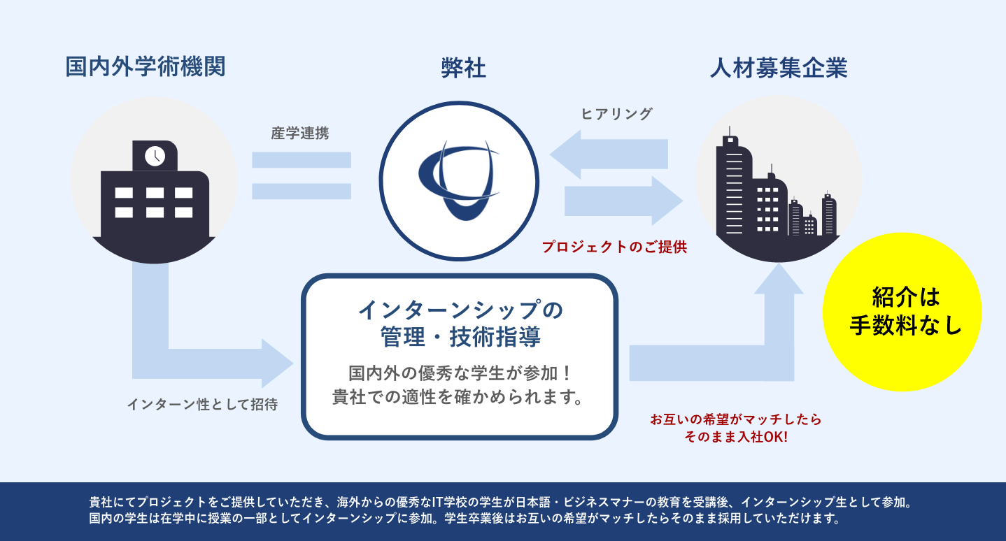 国内外学術機関との産学連携により、IT技術者として見込みのありそうな学生(国籍問わず)をインターン生として国内のIT開発プロジェクトに受け入れる。このプログラム下で彼らを「日本の開発現場で通じる IT技術者」として指導育成した後に顧客企業への紹介・入社支援までをワンストップで実施する、新たなかたちの人材紹介スキームを構築しました。