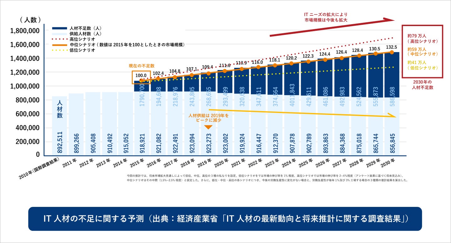近年、産業界では大型のIT関連投資が続いていることや、情報セキュリティ対策の必要性が増えていることなどの理由から、IT関連サービスへの多種多様なニーズが増大しております。しかし、我が国の人口減少に伴い国内の人材供給力が低下している事もあって、IT業界は今後、人材不足がより深刻化していくと予測されています。経済産業省の予測(下グラフ)では、2030年には最大で79万人ものIT人材が不足するといわれています。