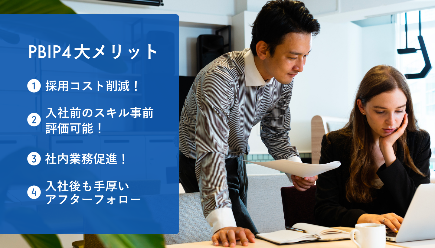 弊社でスタートするPBIPの最大のメリットは国内外人材を雇用する際の不安要素(特に技術スキル、社会人基礎力)をインターシッププログラムを通して事前評価し、学生と企業間の適性を採用活動前に確認できることです。インターン生として1年近くプロジェクトに参加しその「能力評価資料」の提供を受けることで、採用と育成の負担・リスクを低減しつつ新卒ながらも即戦力級だとわかる人材の採用が可能となり、人材不足の解消が可能となります。