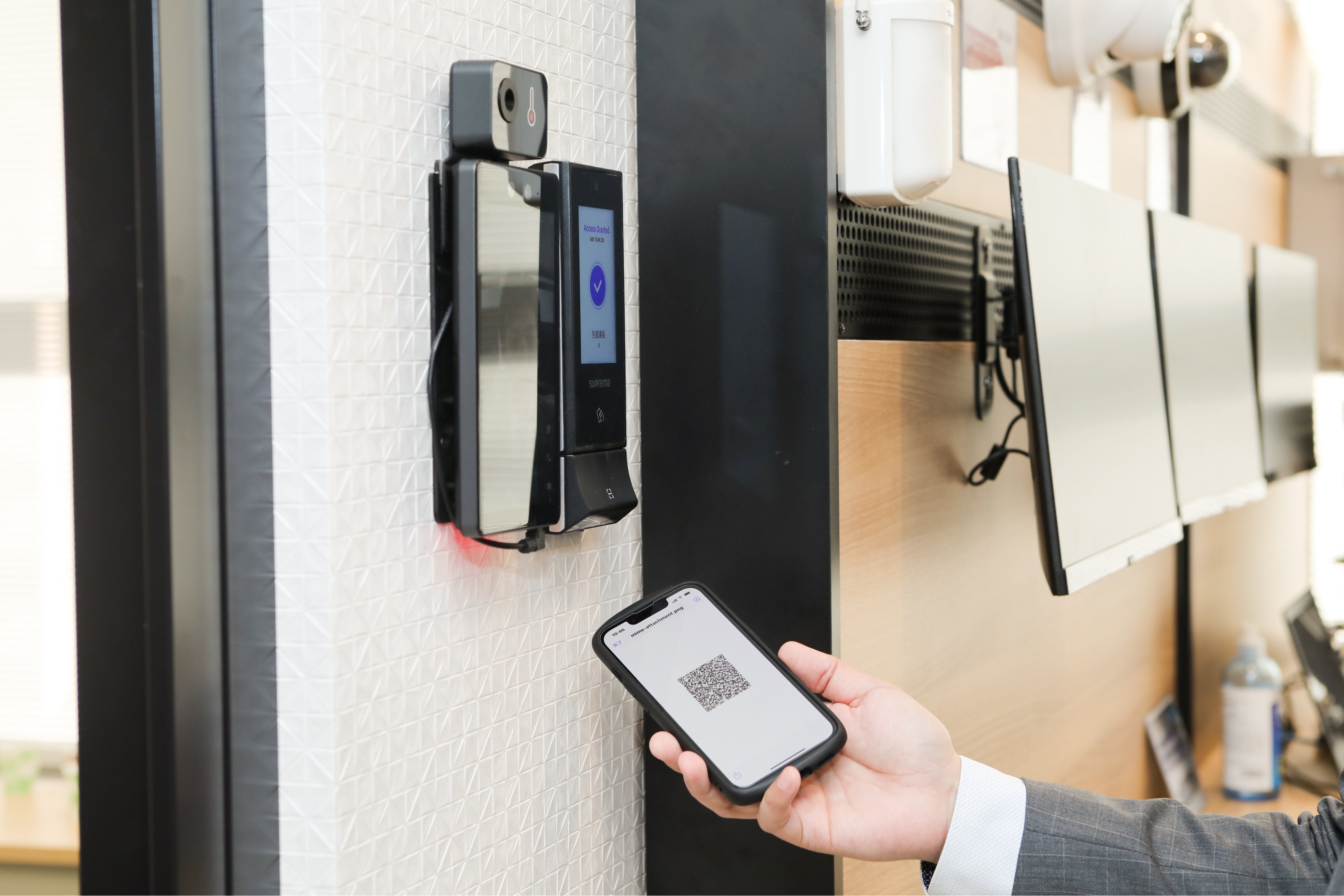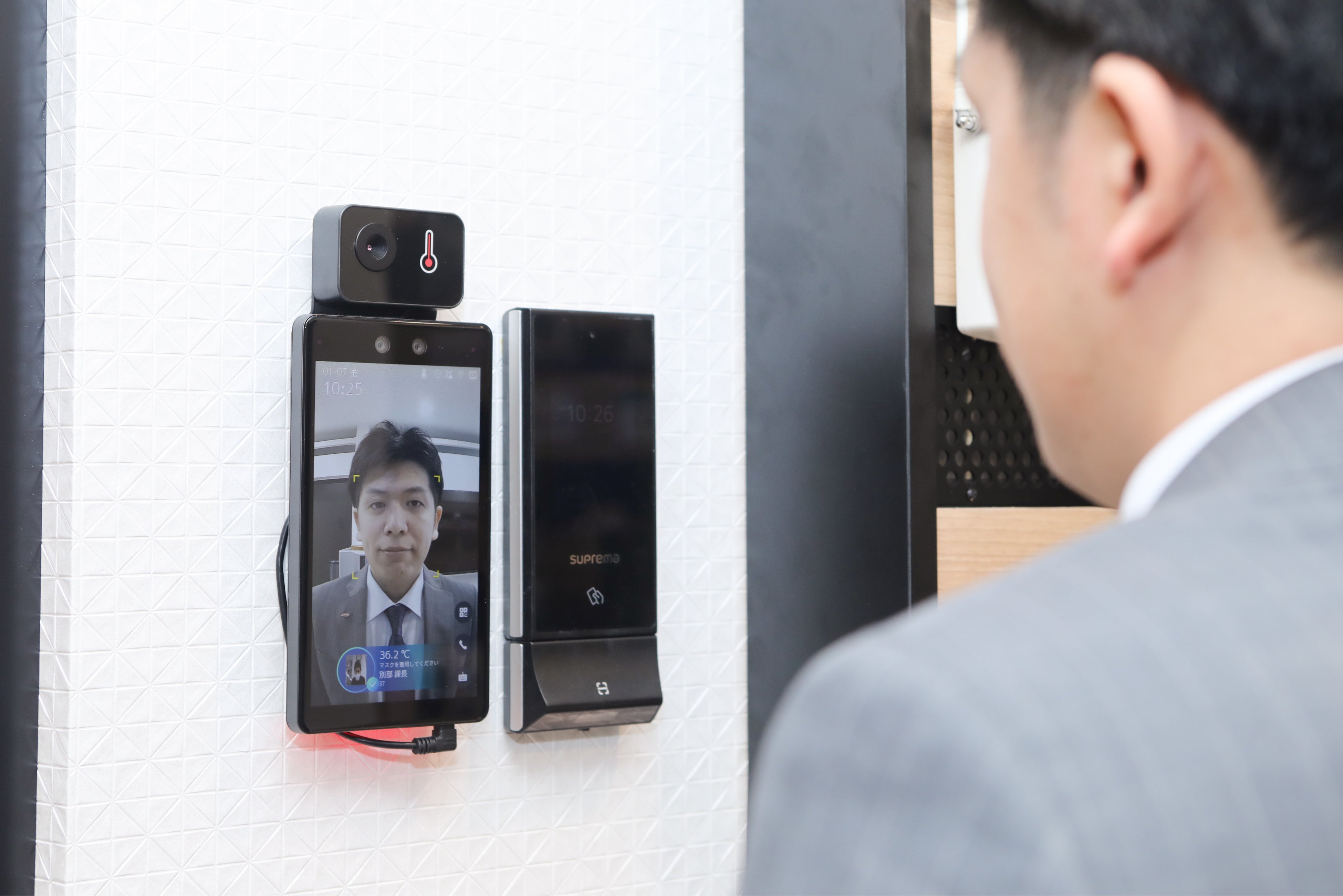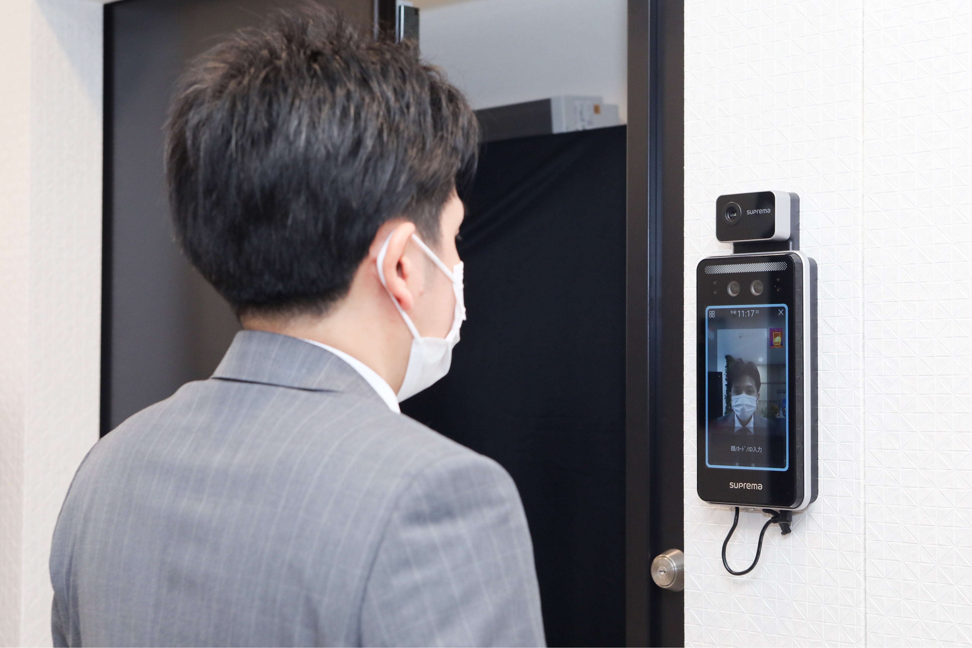 マスクを着けたままの顔認証、サーモグラフィーによる検温、ドアノブに触れることなくドアの開閉が可能に。