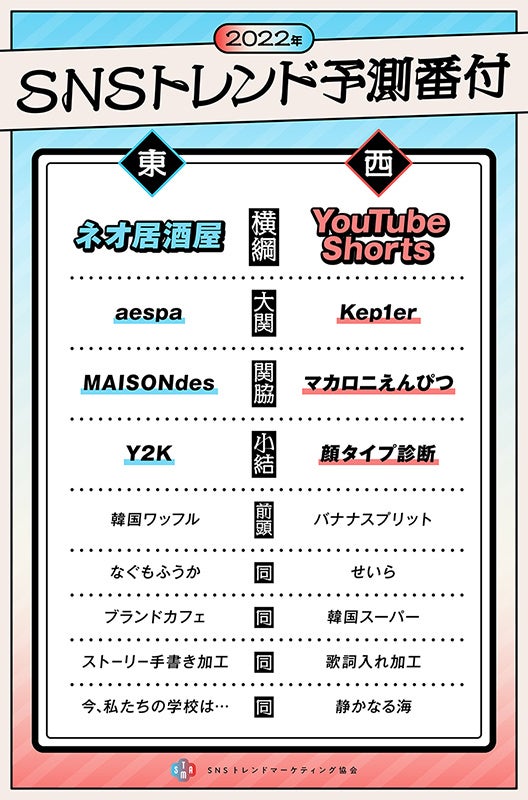 【2022年 SNSトレンド予測番付】横綱は、「ネオ居酒屋」と「YouTube Shorts」 大関は、大注目の新韓流アイドルグループが独占!
