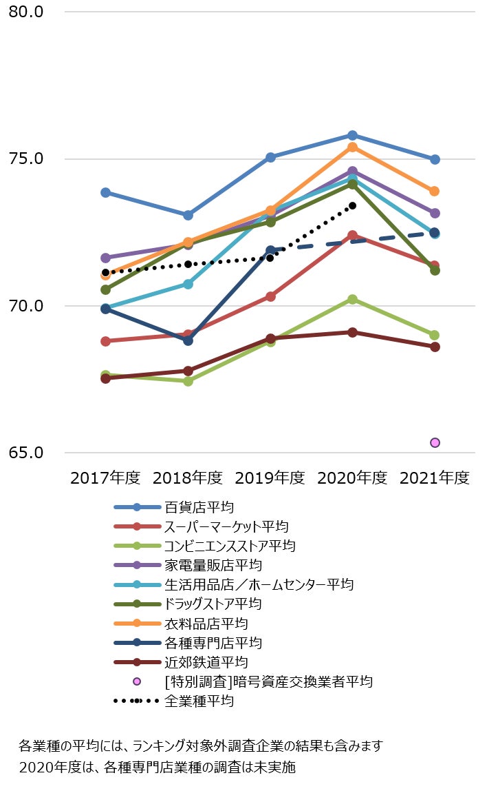 公益財団法人日本生産性本部 サービス産業生産性協議会は2月22日、2021年度JCSI第4回調査として、10業種(百貨店、スーパーマーケット、コンビニエンスストア、家電量販店、生活用品店/ホームセンター、ドラッグストア、衣料品店、各種専門店、近郊鉄道、暗号資産交換業者)の顧客満足度を発表しました。