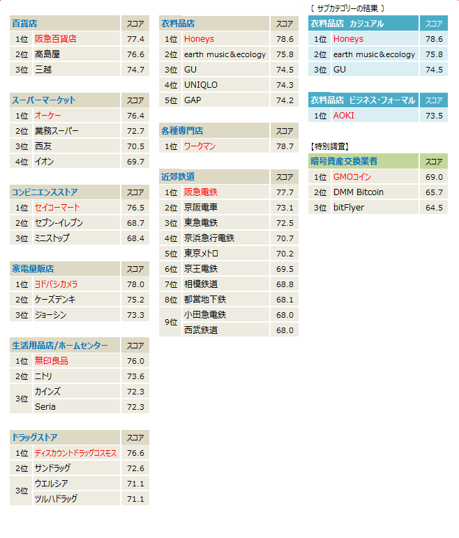 - ※各業種のランキング対象企業のうち、原則として中央値以上の企業・ブランドを表示
