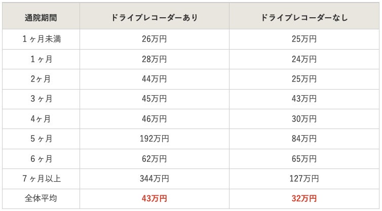 後遺障害慰謝料が含まれている場合もあるため単純な比較はできませんが、ドライブレコーダーの有り無しで金額に差が出ることがわかります。