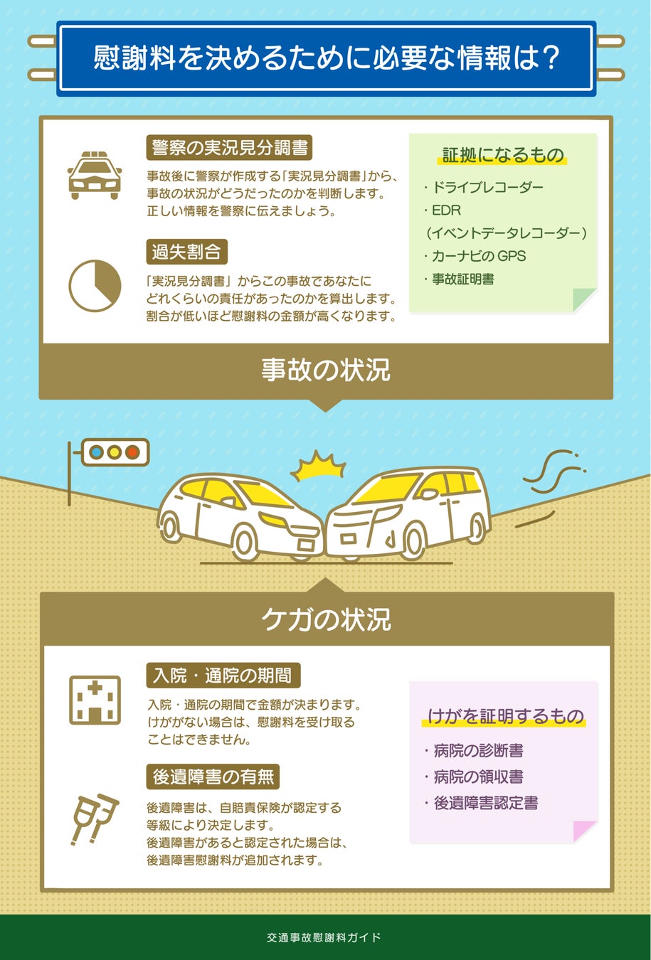 交通事故の慰謝料は、大きく「事故の状況」と「ケガの状況」、ふたつの要素がかけ合わさって決まります。