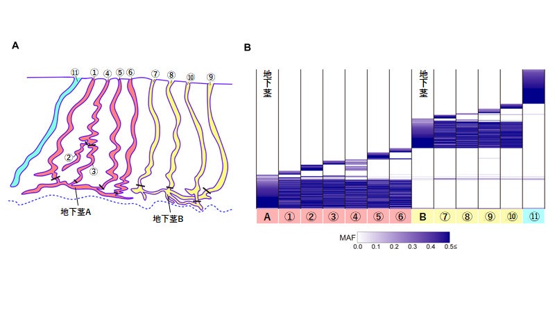 B. 全ゲノム解析結果。縦軸は個々の腺管を示し、横軸は遺伝子変異を示しています。地下茎Aと腺管①~⑥は多くの遺伝子変異が共通していることがわかります。同様に、地下茎Bと腺管⑦~⑩も多くの共通する遺伝子変異を持っています。MAF値は多くの変異で高い値を示しており、地下茎と、地下茎から連続する腺管は同じ遺伝子変異プロファイルを有するモノクローナルな集団であることがわかります。一方、地下茎A・Bどちらにも連続しない腺管⑪は、遺伝子変異プロファイルも独立しています。