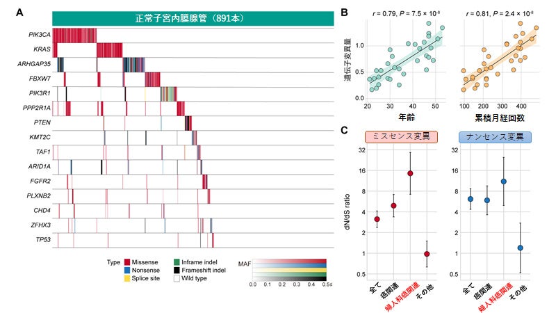 ①正常内膜腺管891本のゲノム解析を行った結果、半数以上の腺管が何らかの癌関連遺伝子変異を有しており、中でも、既報でも報告されていたPIK3CAやKRAS変異*3を有する腺管がそれぞれ15.6%, 10.9%の頻度で見つかりました(図1A)。腺管が有する遺伝子変異の量は、年齢や累積の月経回数に伴って増えることがわかりました(図1B)。また、遺伝子変異の種類に着目して解析を行ったところ、婦人科癌に関連する遺伝子変異に特に強い自然選択圧がかかっており、その遺伝子変異が腺管の生存に有利に働いている可能性があることがわかりました(図1C)。