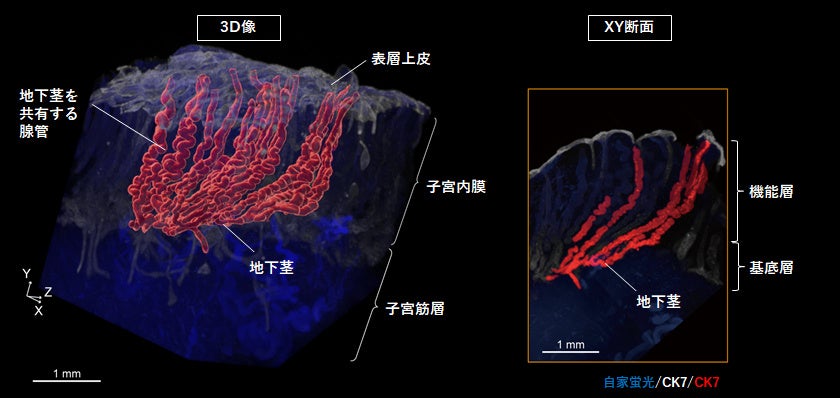 ③しかしながら、子宮内膜は月経のたびに剥がれ落ちる組織であり、どうやって腺管はそのクラスターの領域を拡大していくのでしょうか。その謎を解明するために、本研究グループは子宮内膜腺管の3次元構造に着目しました。本研究グループは、先行研究で子宮内膜の3次元撮影に成功し、月経の際に剥がれ落ちずに残る基底層の腺管に網目のような地下茎構造があることを突き止めています(図3)。