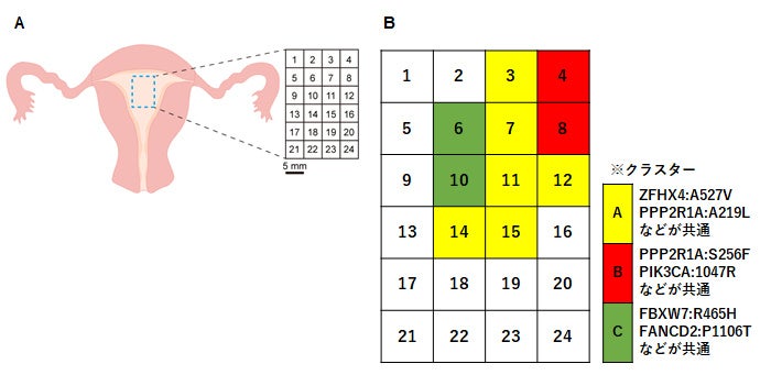 ②それでは、生存に有利な変異を獲得した腺管は、子宮内膜の中でどのように分布しているのでしょうか。それを確認するため、摘出した子宮の内膜を区域分けし、区域ごとに腺管を分離して腺管の位置情報を加味したゲノム解析を行いました(図2A)。その結果、同じ起源の遺伝子変異を持つ複数の腺管が、隣接する区域にまたがって分布し、クラスターを形成していることがわかりました(図2B)。