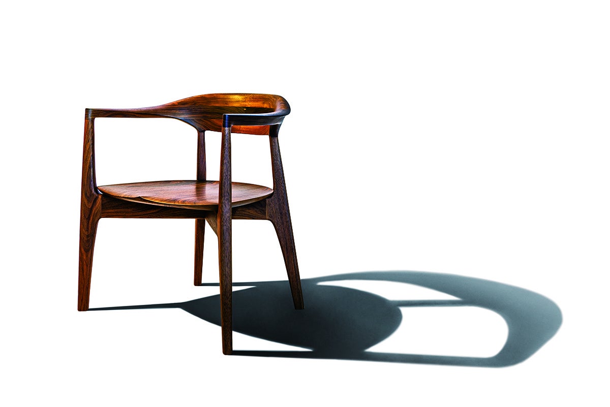背もたれからアームにかけて滑らかな曲面とエッジの効いたラインが特徴の cocoda chair。一つ一つ手道具を駆使して製作し 一点物のクオリティでありながら、製品として展開している。機械では生み出せない美しい三次曲面が、身体にフィットし究極の座り心地を追求した椅子となっている。どこから眺めても完璧な美しさと色気を感じる椅子。デザインと製作:松岡茂樹
