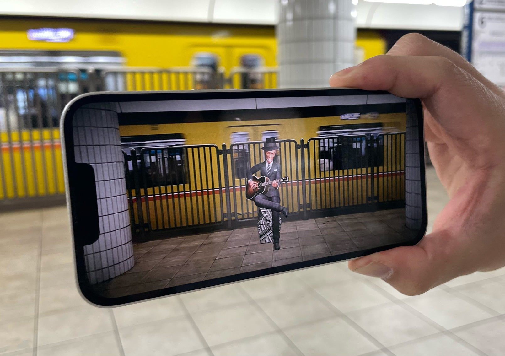 一見何もない空間に、アプリを通してスマートフォンやタブレットをかざすと、おもむろにロバートジョンソンが現れ、弾き語りのライブ演奏が始まります。
