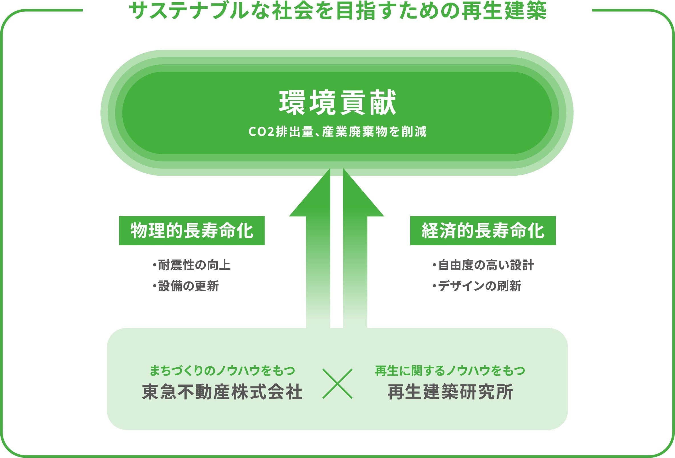 両社の協業により、老朽化物件が抱える様々な課題を解決し、既存建物の「物理的価値(耐震性の向上、設備の更新など)」及び「経済的価値(時代のニーズに合わせて建物の用途変更を行うことができる自由度の高い設計、デザインの刷新など)」を長寿命化させることができます。既存物件を取り壊さずに活かすことで、CO2排出量や産業廃棄物の削減に繋がり、脱炭素社会・循環型社会の実現にも貢献できると考えています。