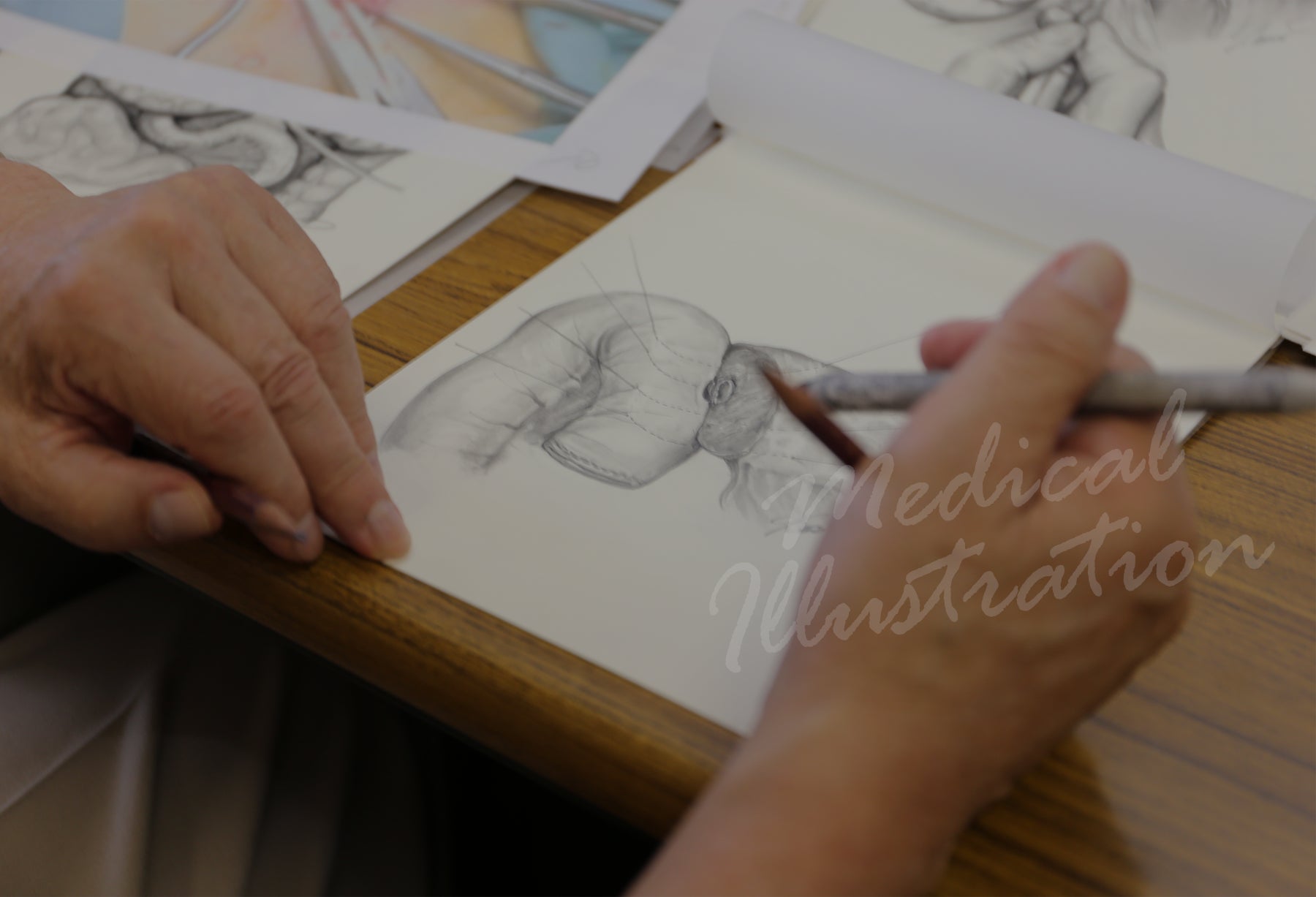 研究・論文・臨床・記録・教育に資する医学医療の可視化に必要な図画図版のことで、医学医療の情報を視覚的に伝えることを役割とします。モノクロのシェーマやデジタルツールを用いたカラーイラスト・3DCGやアニメーションなど、様々な手法をその用途に適した形で使用します。
