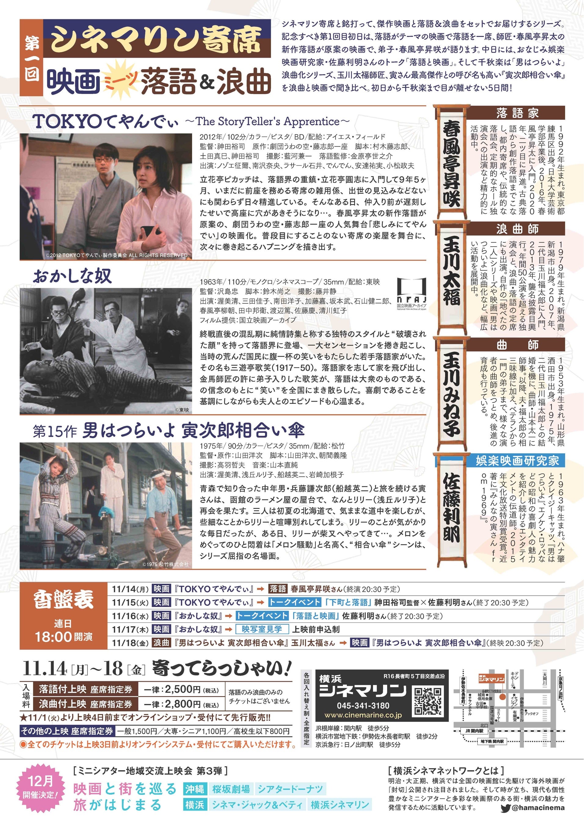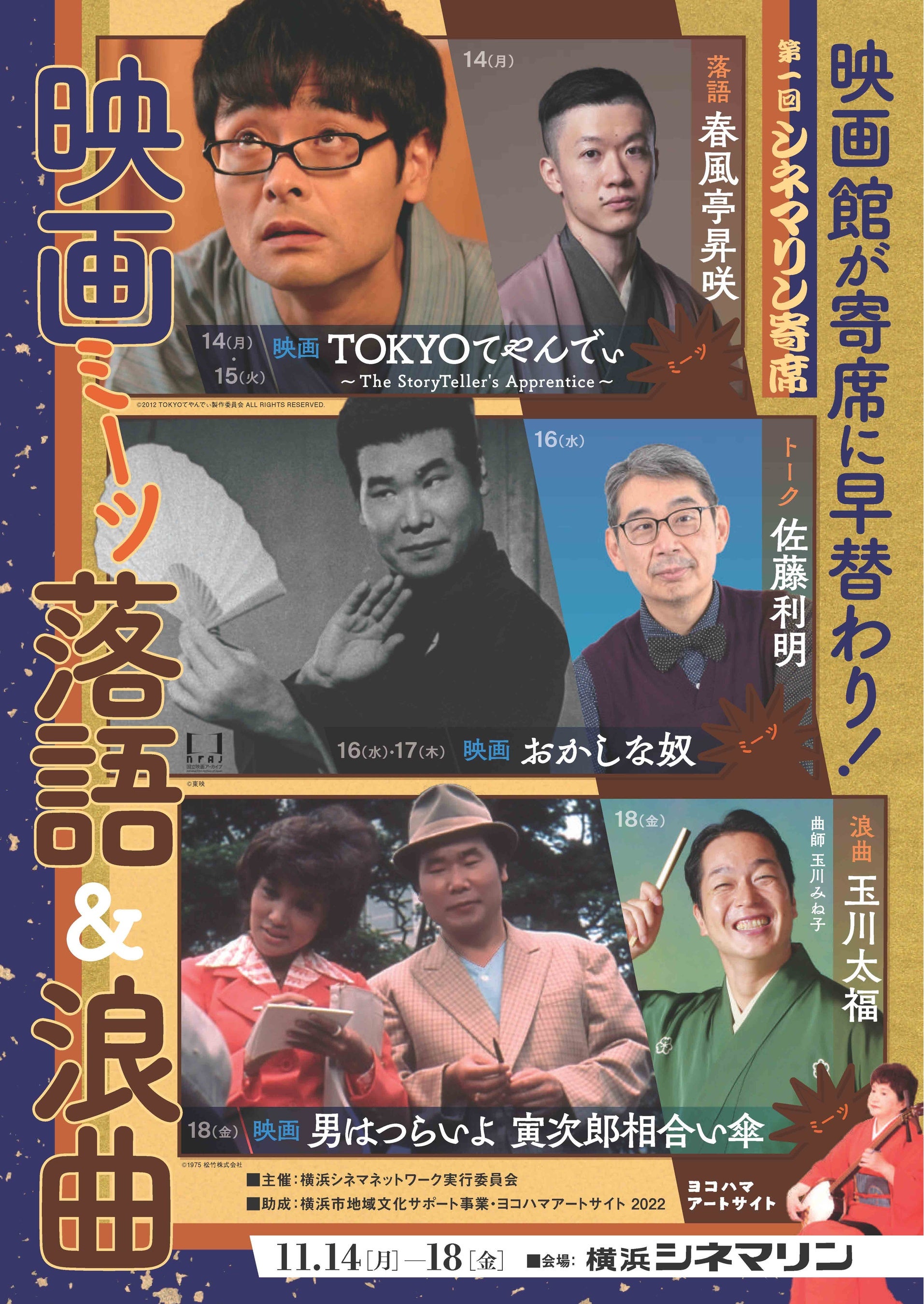 横浜シネマネットワークでは、11月14日[月]-11月18日[金]に横浜シネマリンにて第1回シネマリン寄席[映画ミーツ落語&浪曲]を開催いたします。寄席と言っても映画館ですので、映画を上映して、それに合った落語や浪曲、解説トークを日替わりで口演していただき、両方いっぺんに楽しんでいただこうという企画です。