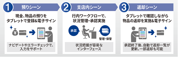 電子サイン運用による授受時間短縮、預り証の不備チェックや付随する管理簿への転記が不要になる等、文書管理の負担を無くすことで渉外・事務担当者双方の事務効率化に貢献します。