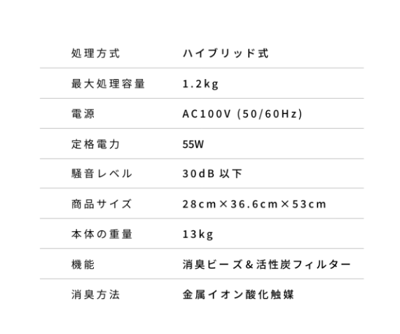 3層の脱臭システムを用いて「除菌」⇒「吸着分解」⇒「化学作用で無臭化」の順番で生ごみの嫌なにおいを取り除きます。