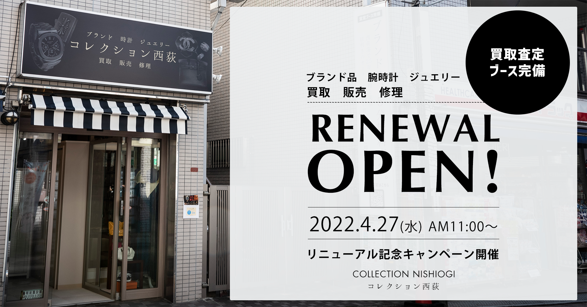 東京西荻窪駅徒歩1分。ヴィンテージブランド品、ジュエリー、腕時計、バッグなどを扱うセレクトショップ「コレクション西荻」が、買取・下取りを強化すべく「査定ブース」完備で2022年4月27日(水)にリニューアルオープンいたします。