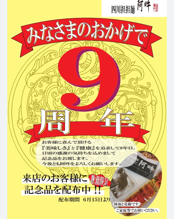四川担担麺阿吽が運営体制を法人化して9年目を迎え、9周年イベントを開催。6月15日より来店のお客様に感謝を込めてプレゼントを配布します。