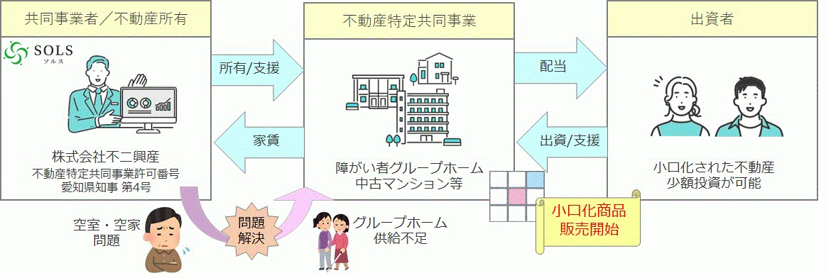 本事業は多くの人から小口の出資を受け、その資金で不動産を取得し、その不動産取引から生ずる利益を出資者に分配する仕組みです。この事業は、当社サービスの「新・大家ライフ」における活動「空室・空家問題を解消するべく、既存建物・中古不動産を再生活用し循環するサイクルを作る!」にご賛同いただける投資対象者(お客様)が一緒に出資し運用する 「社会貢献型の新しい不動産投資」です。