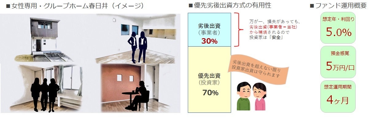 今回、展開する「女性専用」グループホーム春日井も私たちでお貸ししている物件になり、ハンディキャップのある人達が地域の中で普通に暮らせるための家であり、共同生活を送ることで楽しみやコミュニケ-ションに触れ、社会から孤立することなく仲間・地域と楽しく生活する場所になります。- ファンド運用について