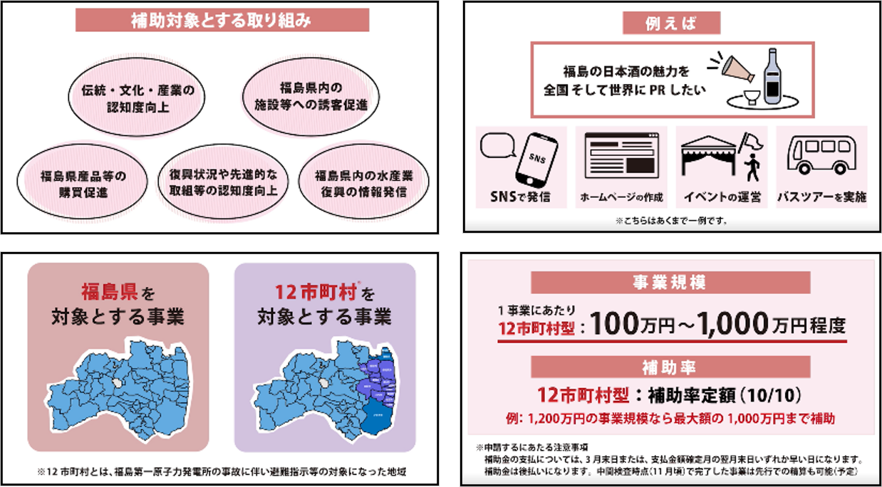 この支援事業は福島県の伝統・ 魅力等の発信により福島県に対する国民の関心を高めることを通じて、復興の現状に関して正確な情報が発信される基盤を整備すること。そして風評被害の払拭や交流人口の増加を促進し、福島県における民間企業の事業基盤の安定化を図ることを目的としています。