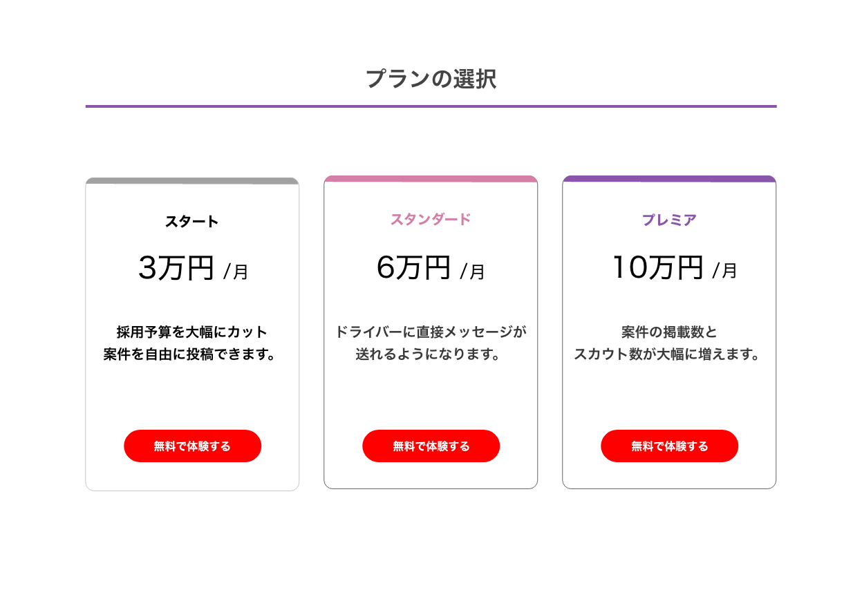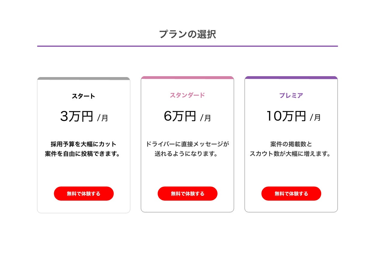 スタートプランの内容:案件の掲載が自由にできます。ドライバーとの連絡や契約の締結まで可能です。ただしドライバーへの直接コンタクトと、スキルシートの確認はスタンダードプランからとなります。