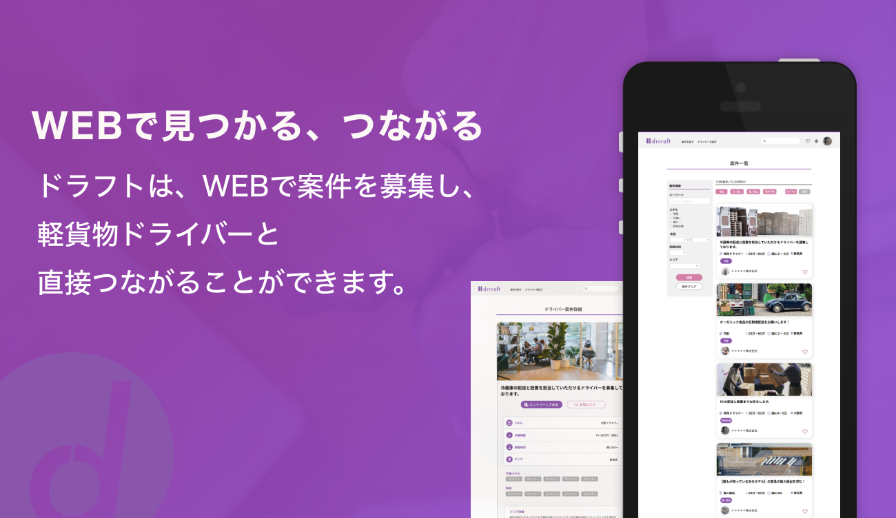 事業内容 : 軽貨物ドライバーと荷主のマッチングプラットフォーム drrraft(ドラフト)運営