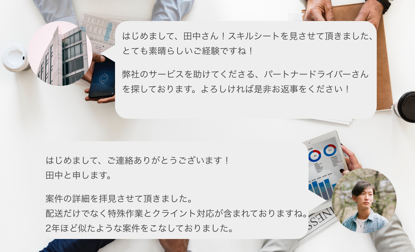 作成した案件をもとにドライバーと直接交渉ができます。