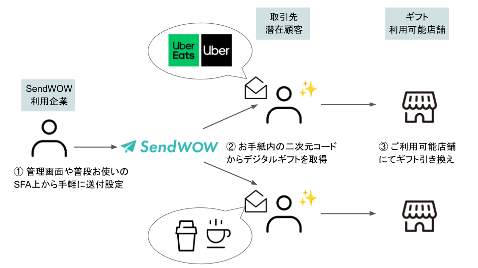 株式会社Smapo(スマポ)(本社:東京都中央区、代表取締役:蔭山明里 以下「Smapo」)は、法人営業活動に「感情」を組み込むオフラインエンゲージプラットフォーム「SendWOW」にて、 Uber Eats(ウーバーイーツ)や Uber Taxi(ウーバータクシー)でご利用可能な Uber バウチャー、及び全国展開をするコーヒー店でご利用可能なドリンクチケットなどデジタルギフト付きのお手紙・メッセージカードや贈り物の拡張をいたしました。