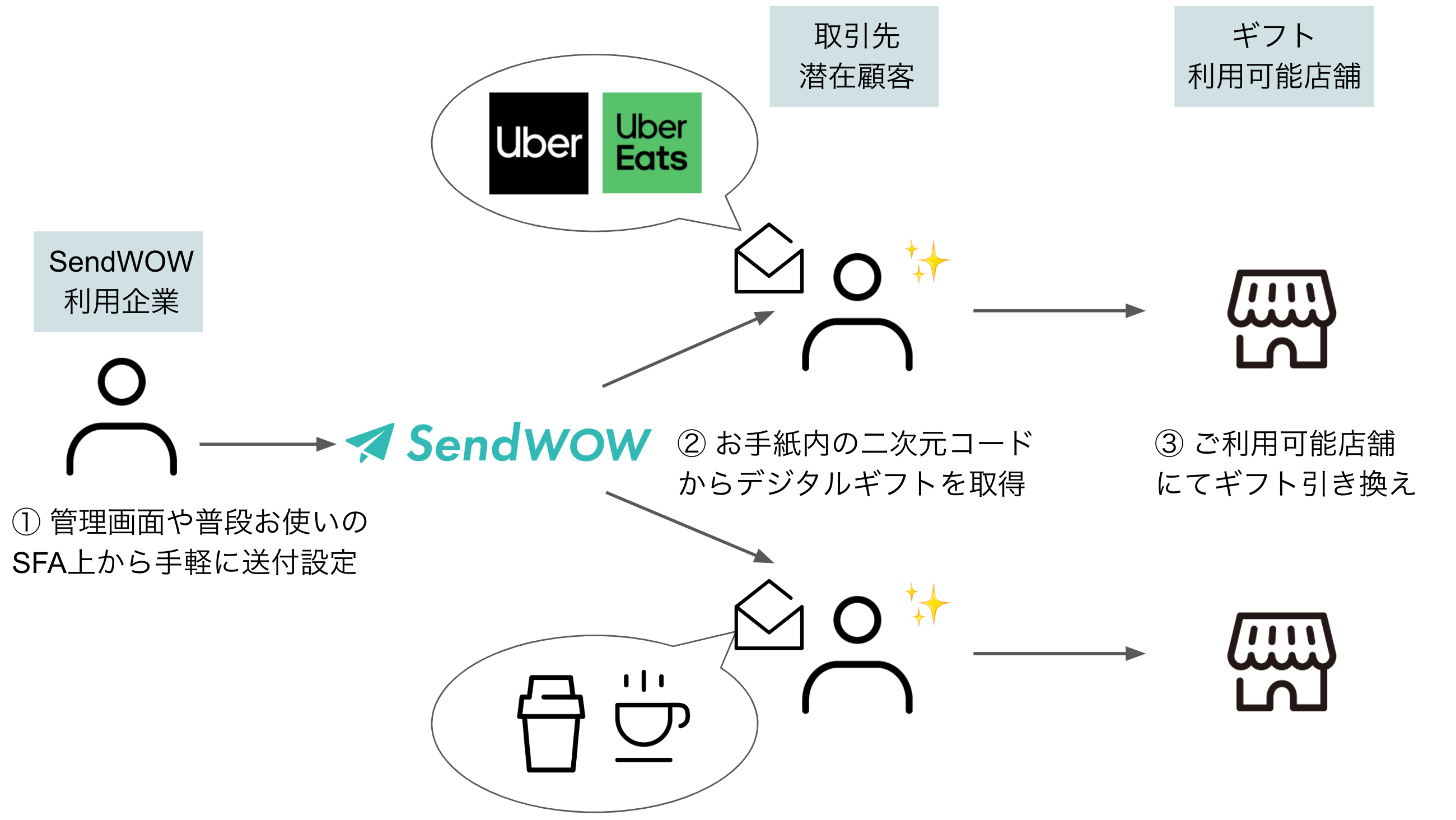 (※1) レストランやカフェなど様々な店舗で利用できる電子化されたギフトで、SendWOWでは二次元コードで提供されます