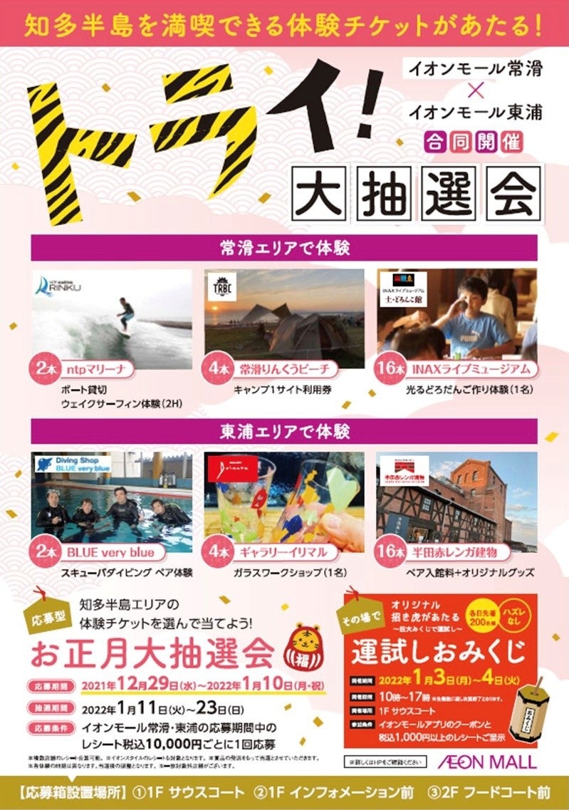 イオンモール常滑とイオンモール東浦は、『知多半島でワクワク体験にトライ大抽選会』を、下記のとおり開催します。