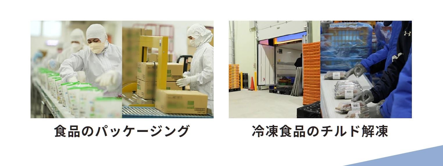 食品のパッケージングや冷凍食品のチルド解凍等の、食品流通加工の実績も多数ございます。食品製造業様のご要望にあわせて、レーンの追加・倉庫規模の拡張といった対応も相談いただくことも可能です。