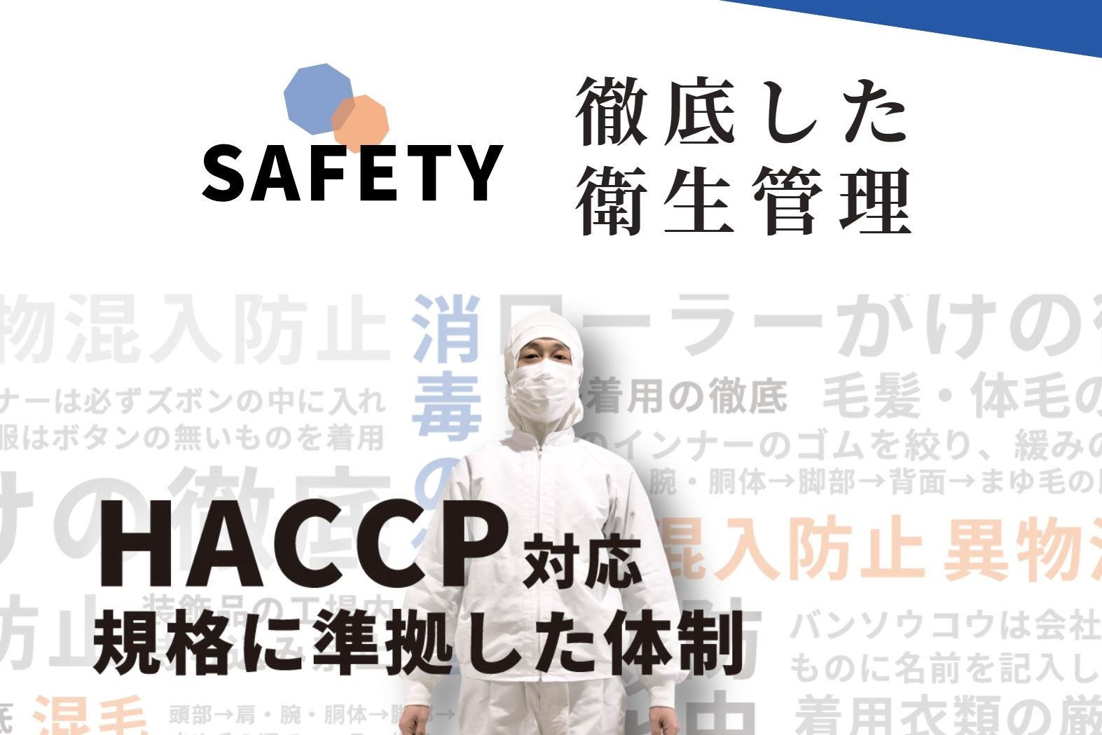 防虫・防鼠等の設備への対策、異物混入を防ぐ従業員への着衣対策、衛生ルームへの入室時の手洗い・うがいのシステム化といった衛生ルールは食品製造工場と同等のHACCP規格に準拠した体制で対応しております。
