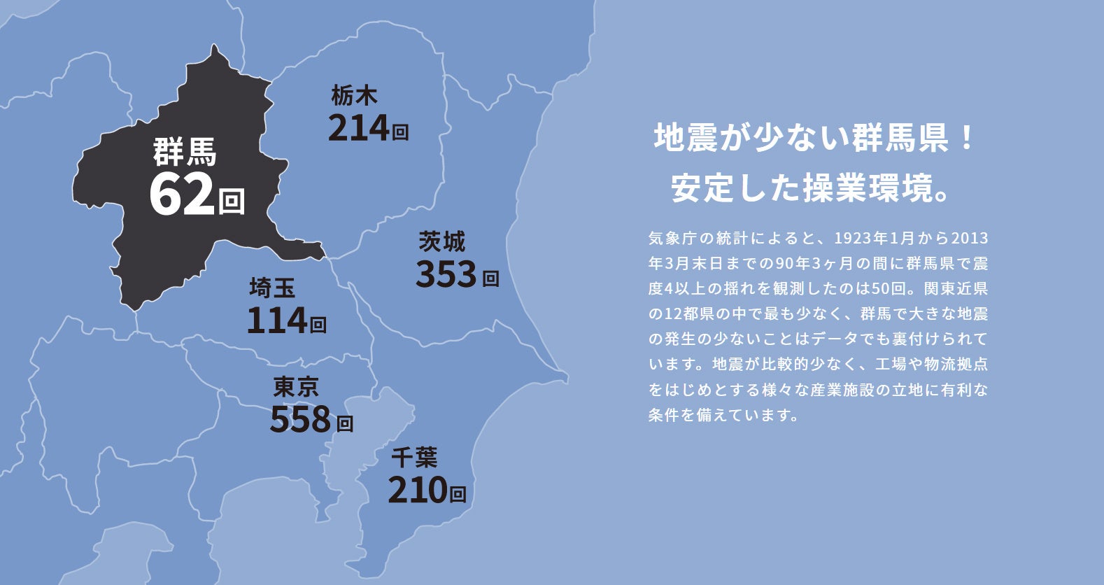 群馬県は関東近県の12都県の中で最も地震発生率が少なく、工場や物流拠点の立地条件を備えています。食品製造業様の商品が1箇所の倉庫に集中している場合は、災害や事故等のリスクに備え分散を推奨しております。