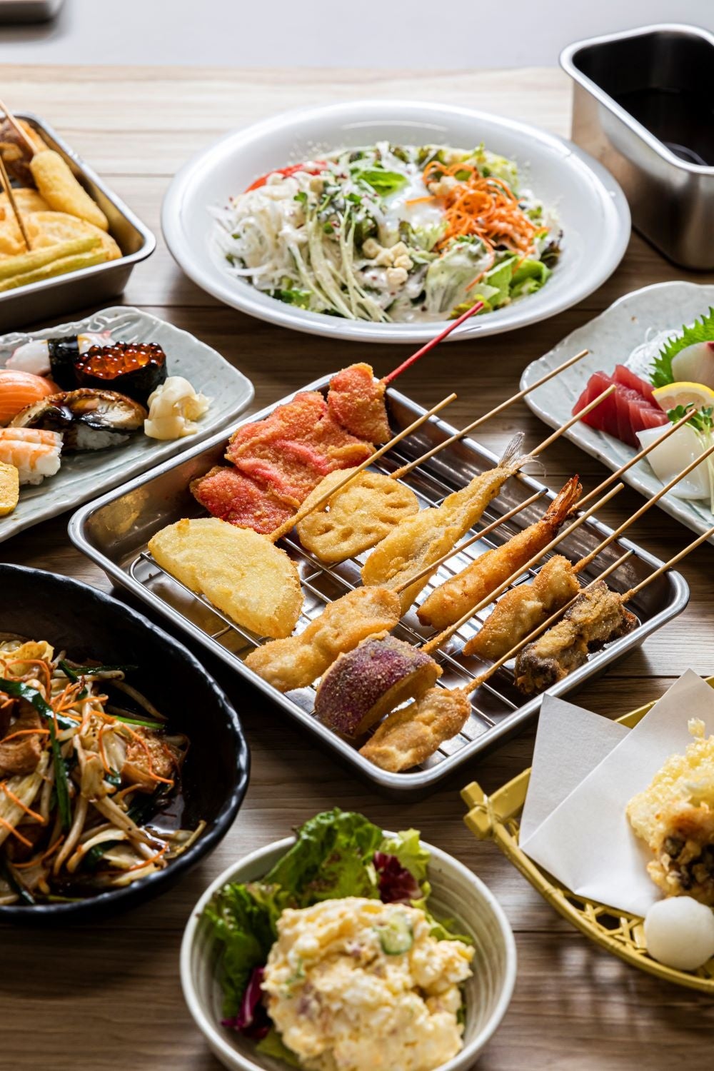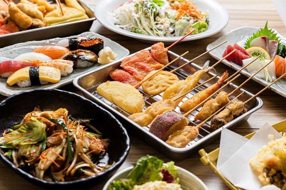 満マルでは創業以来、多くのメニューを「手作り」しています。特に串カツと握り寿司は満マル名物!串カツは具材を串に刺すところから店舗で行い、衣までがオリジナル。寿司は職人が握り、酢飯やネタの仕込みにもこだわっています。その他、焼き物・揚げ物など全200以上の品揃え!食を通じ、皆様に「笑顔」「元気」「感動」を提供し続ける事がモットーの満マル!ぜひお誘いあわせの上、ご来店ください。