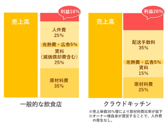 ランニングコスト面では、他社クラウドキッチンと異なり、可能な限り低価格に最低賃料を設定し、上限を設けた売上歩合賃料を設定することで、売上高に応じた無理のない運営を支援します。