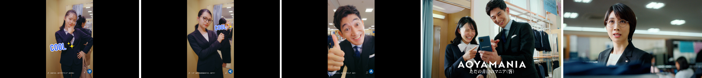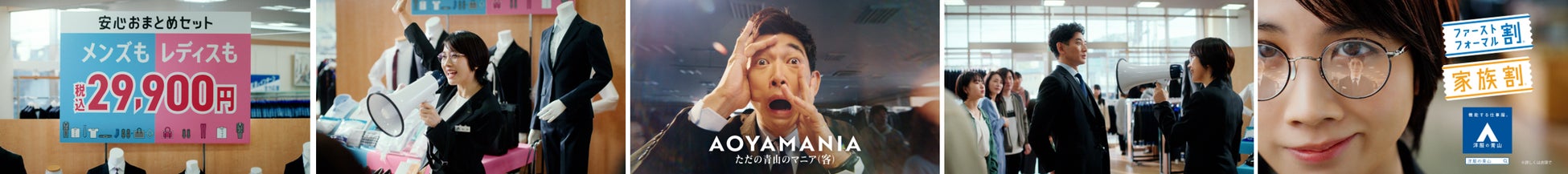 また、この他に「安心おまとめセット マニアの弱点」篇では、「安心おまとめセット」(スーツとコーディネートアイテムが揃うフレッシャーズ限定のお得なセット)に興味深々の「AOYAMANIA」永山さんに「フレッシャーズじゃないですよね⁉」と松本さんが詰め寄る内容となっており、前作では「AOYAMANIA」に戸惑っていた新人店員 松本さんの成長が垣間見える内容となっています。