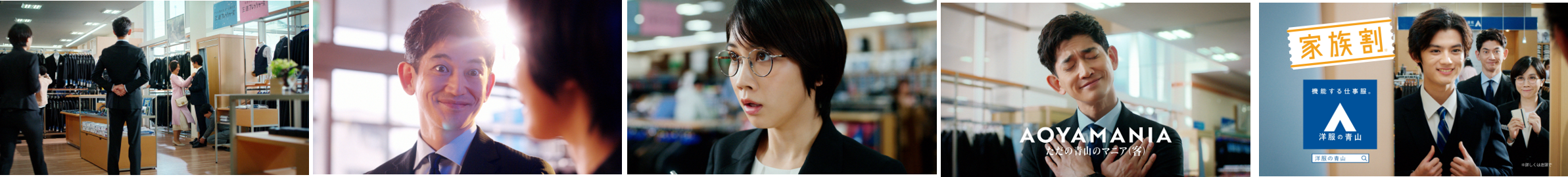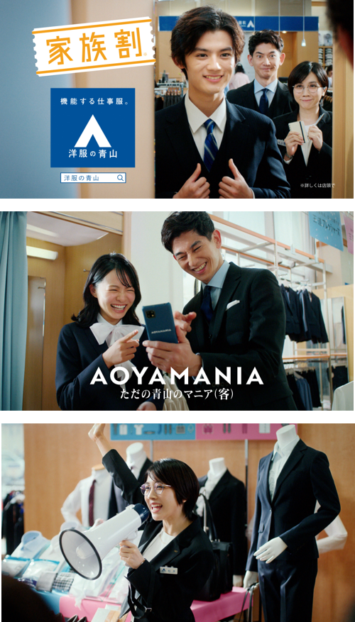 本CMは、誰よりも「洋服の青山」に詳しい「洋服の青山」のファンである「AOYAMANIA」役の永山瑛太さんと、新人店員役の松本穂香さんを通して、「洋服の青山」の魅力をファン目線で描いた「AOYAMANIA」シリーズの第二弾です。今回、新たにフレッシャーズのお客様役として、莉子さん・藤原大祐さんを起用した「フレッシャーズメンズ お母さん」篇、「フレッシャーズレディス ポーズ」篇、「安心おまとめセット マニアの弱点」篇の3パターンの新CMがスタートします。