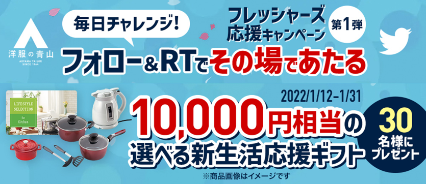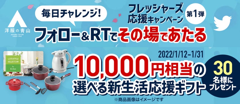 新CM公開に合わせ実施されるフレッシャーズ向けのTwitterキャンペーンでは、選べる新生活応援ギフト 10,000円相当のギフトコードが抽選で当たる「フォロー&リツイートキャンペーン」、さらにWチャンスとして「洋服の青山オンラインストア」で使えるデジタルギフトコードが当たる「Wチャンス!ハッシュタグキャンペーン」も企画しています。