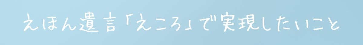 そんな現状に対して、自分の人生を絵本という親しみやすい形にまとめ、ご家族、お孫様と一緒に楽しんでいただきつつ、同時に将来のご相続に備えておくことができれば、相続トラブルはかなりの割合で回避できると考えています。絵本のちからで、遺言書を書くことがもっと楽しく身近な文化になり、遺言書をきちんと準備したことで相続トラブルに見舞われることなく、家族の幸せが末永く続く―そのために、えほん遺言「えころ」を活用していただきたいと考えています。(*1 国境なき医師団 終活と遺贈に関する意識調査2017から引用)