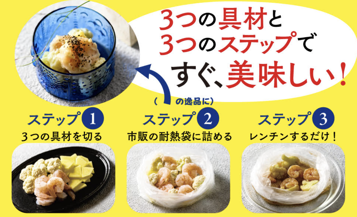 3つの食材を切る、2.市販の耐熱袋に詰める、3.レンチンするだけで