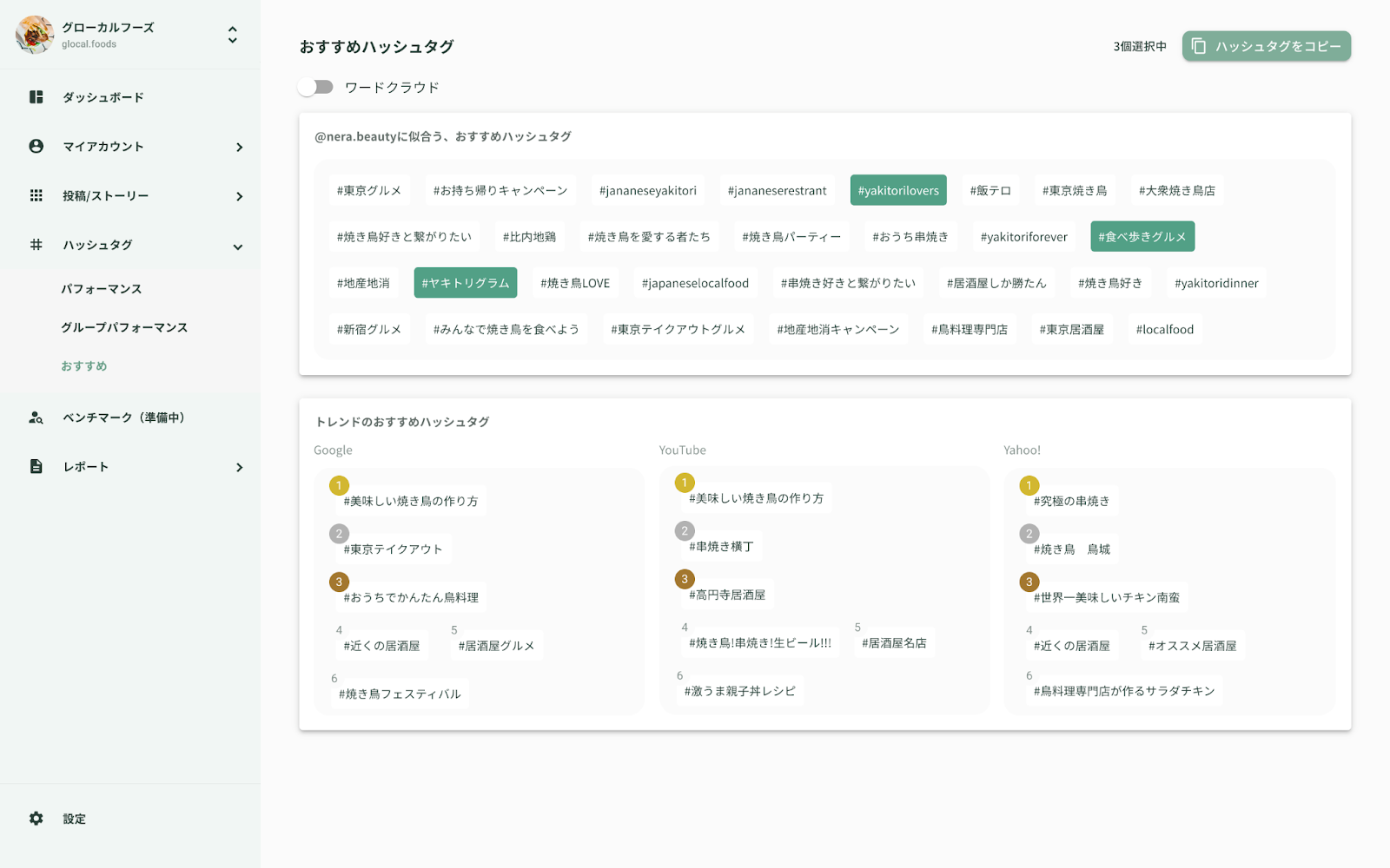 Instagramではハッシュタグが重要で、「何をつけるべきなのか」「何が良かったのか」を正しく把握する必要があります。ハッシュタグのレコメンド機能ではハッシュタグの効果の分析はもちろん、アカウントの初期設定に合わせた登録ワードに関連するもので『今日ボリュームが多いキーワード』を各プラットフォームから抽出してAIがレコメンドするため、ハッシュタグの考案と選定を効率的に行うことが可能となっています。