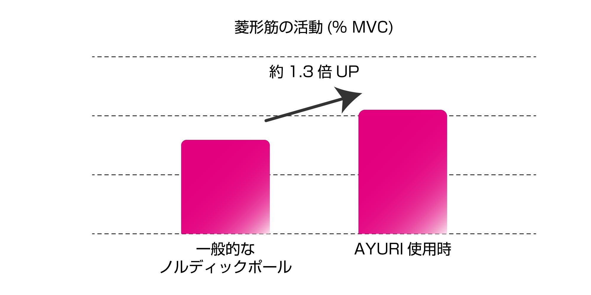 下表「菱形筋の活動」について、筋力を測定する表面筋電図により一般的なノルディックポールとAYURIで比較しました。歩行時の最大随意筋力(Maximal voluntary contraction ; MVC) を測定の結果、AYURI使用時は活動率が約1.3倍UPしており、肩甲骨を寄せる菱形筋が活性化するため背中のラインを綺麗にすることが可能です。
