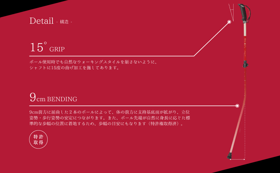 尚、こちらの15度のグリップ角度と進行方向に9cm屈曲させた独自の形状は特許を取得しております(以下)。