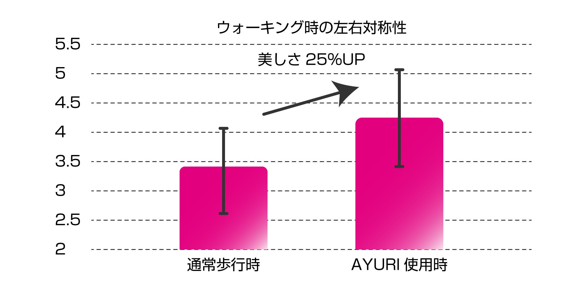 下表「ウォーキング時の左右対称性」について、およそ10名の女性モニター(40代の方々)の身体に加速度計(マルチセンサー)を取り付け計測を行いました。腰部分の中央値に対して歩行時の左右の振れ幅を計測し、AYURI未使用・使用時で比較したところ、AYURI使用時には左右対称性(美しさ)が25%UPしており、歩き方が均等に補正されるため傷害を予防しながら安全にウォーキングをすることが可能となります。
